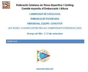 Calendario CONVOCATÒRIA CAMPIONAT DE CATALUNYA EMBARCACIÓ FONDEJADA INDIVIDUAL, EQUIPS i JOVENTUT 2023 Llegir més » 17 de julio de 2023